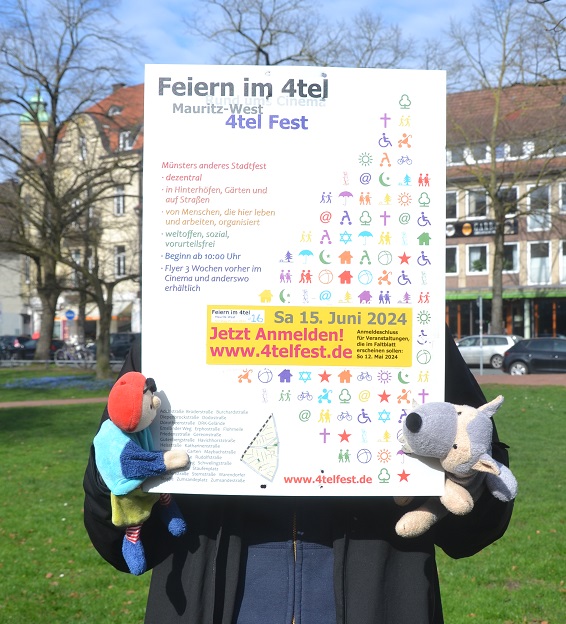 [17.03.2024] Am 15. Juni 2024 wollen wir wieder gemeinsam feiern auf den Straßen und Plätzen, in den Hinterhöfen und Gärten des 4tels zwischen Bahn, Ring und Wolbecker Straße. Veranstaltungen und Aktionen wie Musik und Konzerte, kreative und künstlerische Angebote oder Mit-Mach-Aktionen können von allen Anwohnenden im Zeitraum vom 03.04. bis 12.05. über die Homepage angemeldet werden. Auf den Anmeldestart machen jetzt schon viele bunte Plakate aufmerksam, die seit dem Wochenende (17.03.) in den Straßen des 4tels hängen. Vielen Dank an alle, die das Foto möglich gemacht haben und die Plakate in den Straßen verteilt haben!