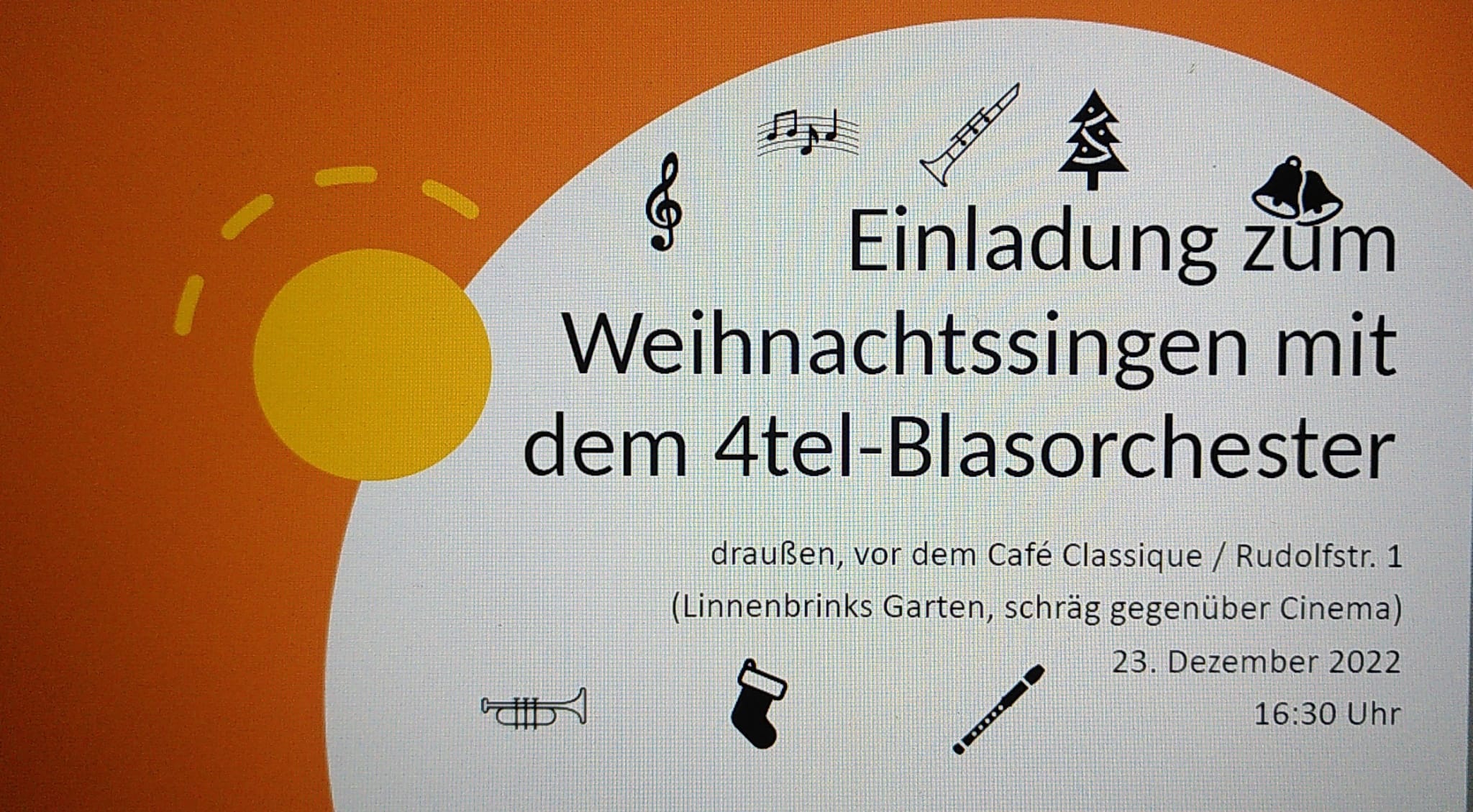 Am 23. Dezember 2022 findet endlich wieder das Weihnachtssingen mit dem 4tel-Blasorchester statt. Wegen der Baustelle ist auf dem Staufenplatz leider nicht genug Platz, darum spielt das Blasorchester auf der Veranda beim Café Classique neben Linnenbrinks Wiese (Rudolfstr. 1, schräg gegenüber vom Cinema). Um 16.30h geht es los.