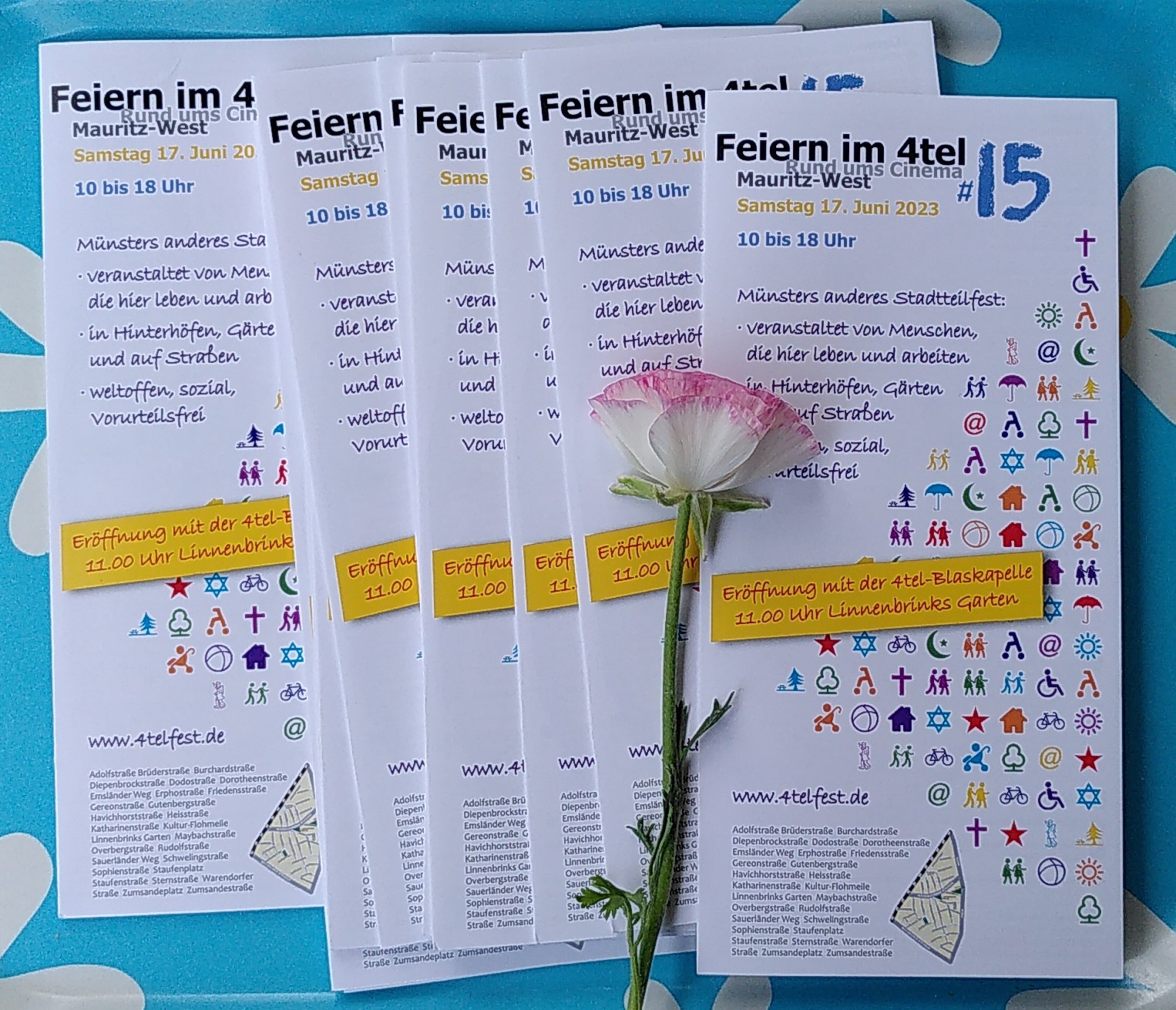 [26.03.2023:] Am 17. Juni 2023 wollen wir wieder gemeinsam feiern auf den Straßen und Plätzen, in den Hinterhöfen und Gärten des 4tels zwischen Bahn, Ring und Wolbecker Straße. Veranstaltungen und Aktionen wie Musik und Konzerte, kreative und künstlerische Angebote oder Mit-Mach-Aktionen können von allen Anwohnenden im Zeitraum vom 05.04. bis 07.05. über die Homepage angemeldet werden. Auf den Anmeldestart machen jetzt schon viele bunte Plakate aufmerksam, die seit dem Wochenende (26.03.) in den Straßen des 4tels hängen. Vielen Dank an alle, die das Foto möglich gemacht haben und die Plakate in den Straßen verteilt haben!