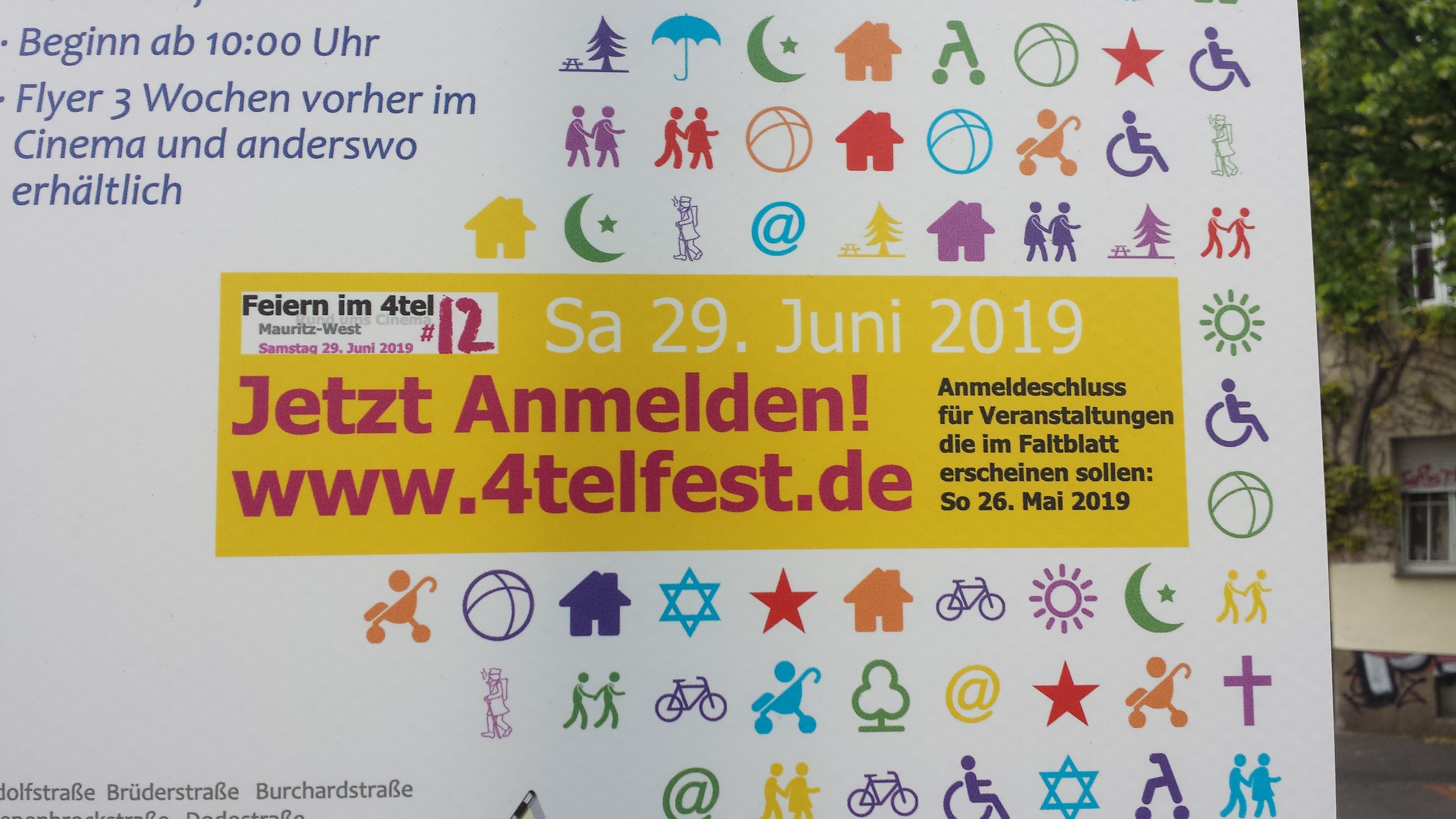 Noch bis Sonntag 26.5.2019 habt ihr die Möglichkeit euch anzumelden! Alle Anmeldungen, die bis zum 26.5. auf der Homepage eingetragen sind, werden im 4tel Fest Faltblatt abgedruckt.